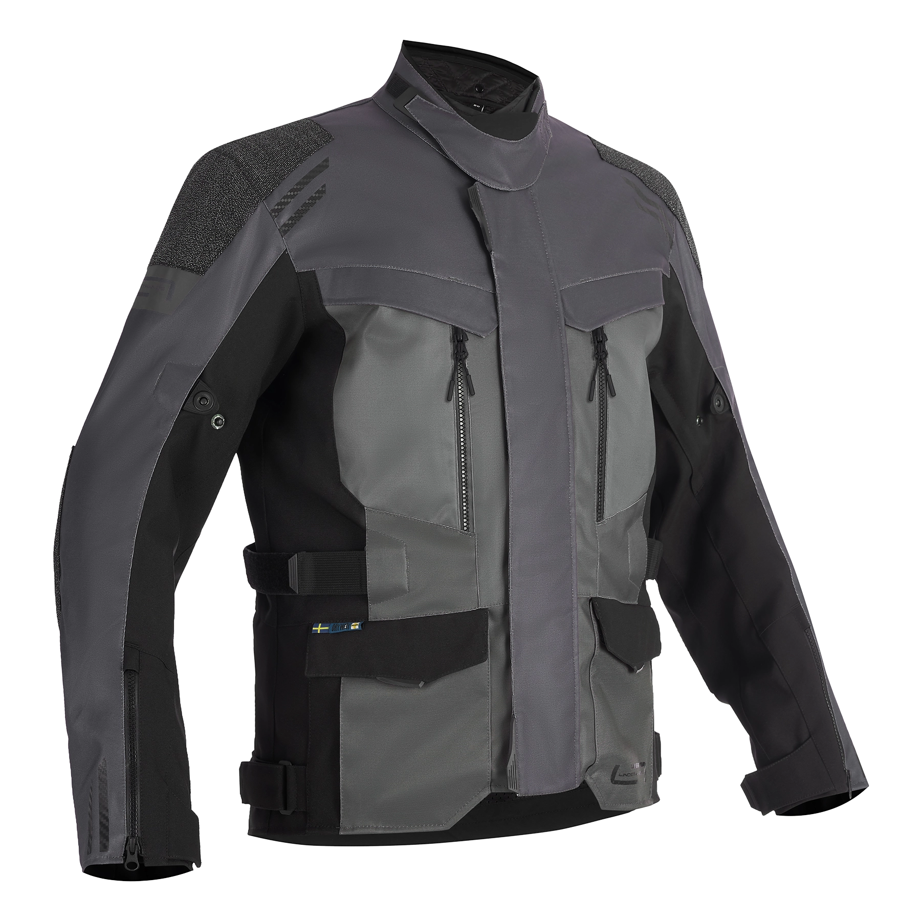 Vatten- och vindtät samt ventilerande laminerad 2-lagers textiljacka med stretchegenskaper. CE certifierad, klass AA.