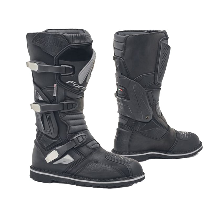Fulländad adventure-stövel i oljebehandlat fullnarvsläder med vattentätt Drytex andningsmembran och lästen är Extra Comfort Fit. Specifik sydd sula i gummi för adventure, enduro och ATV-bruk. F.C.S ledat ankelskydd med dämpat stopp i teknikens rörelse. Tåjärn med skruv medföljer stöveln, dock ej monterat.